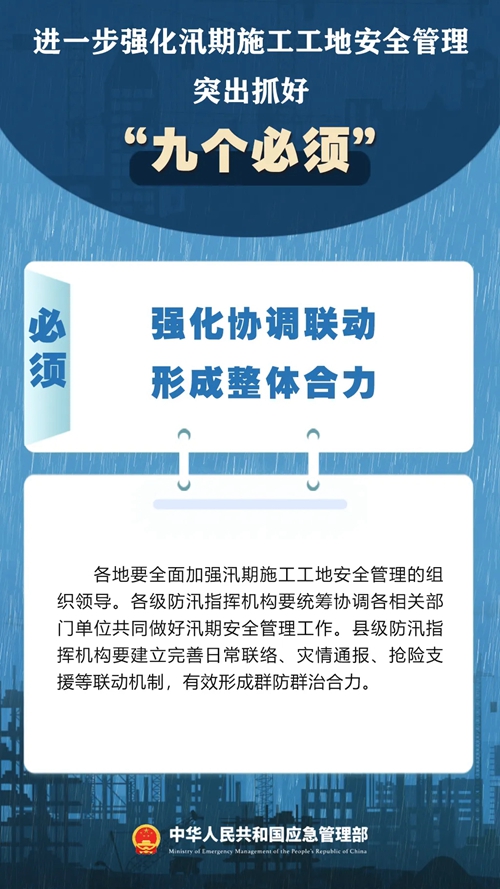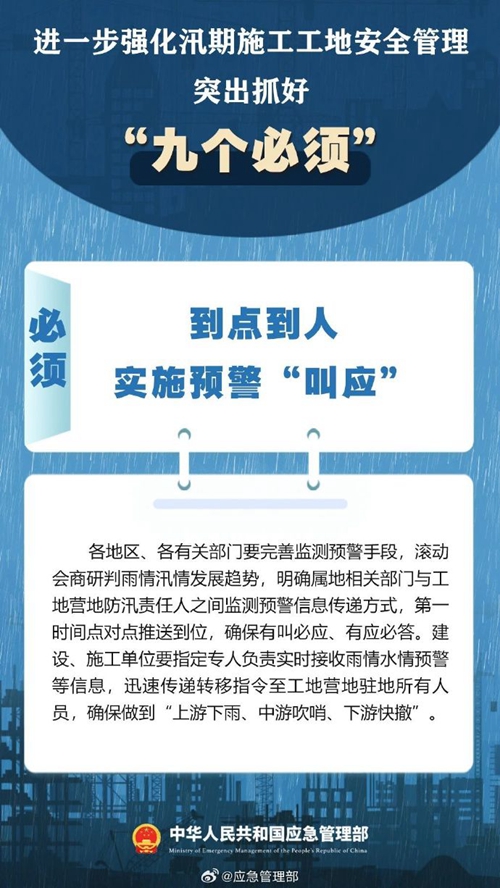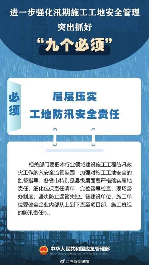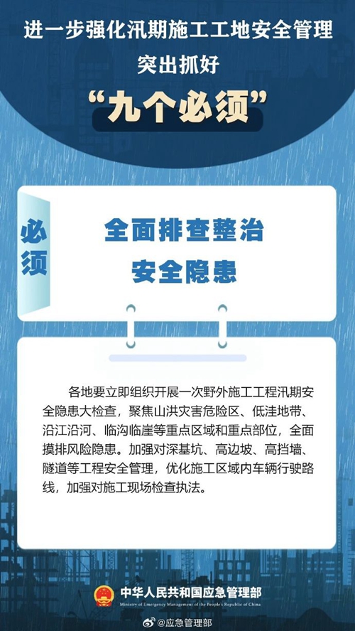 7月9日,國家防災(zāi)減災(zāi)救災(zāi)委員會(huì)辦公室印發(fā)緊急通知,進(jìn)一步強(qiáng)化汛期施工工地安全管理,要突出抓好“九個(gè)必須”↓↓ ???