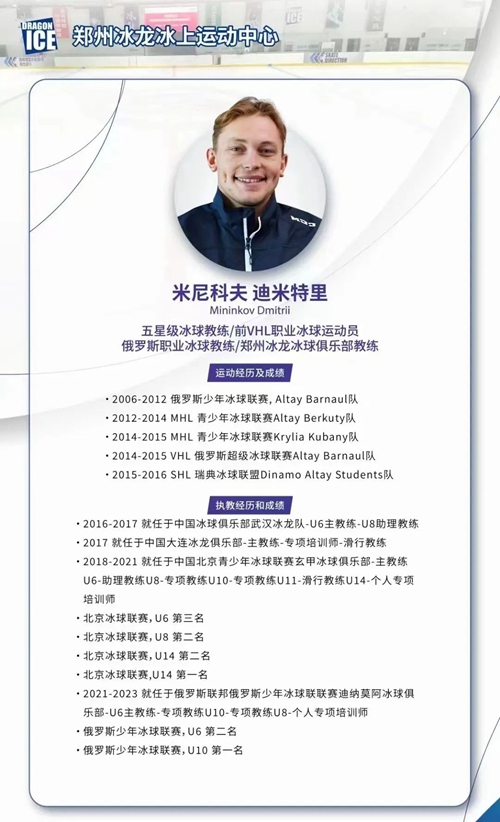 鄭州奧體冰龍冰上運(yùn)動(dòng)中心是一座現(xiàn)代化冰上訓(xùn)練綜合場館。新年伊始,冰龍冰上運(yùn)動(dòng)中心迎來國際知名冰球教練米尼科夫·迪米特里,國家E級教練員趙鐵北、馬騰飛入駐,將通過豐富的執(zhí)教經(jīng)驗(yàn)和專業(yè)知識,為河南冰雪運(yùn)動(dòng)注入鮮活動(dòng)力!