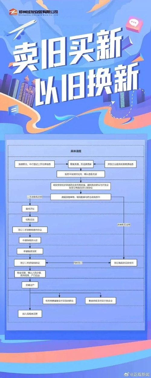 鄭州房產(chǎn)市場(chǎng)“賣舊買新、以舊換新”旨在滿足群眾改善性住房需求。具體來講,由政府指定收購主體—鄭州城市發(fā)展集團(tuán)有限公司與具有改善需求的換房群眾進(jìn)行洽談,通過價(jià)格評(píng)估、銀行貸款等一系列工作流程,收購群眾二手房源,為群眾購買新房提供資金支持,暢通買賣渠道。此外,群眾也可通過市場(chǎng)化方式進(jìn)行交易。