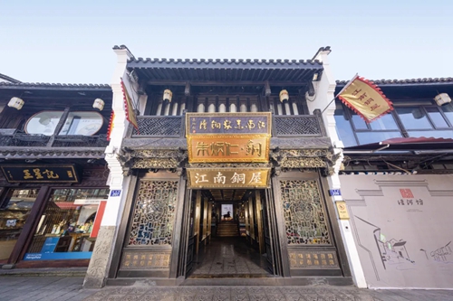 以朱炳仁團(tuán)隊(duì)打造的銅屋系列為例:入駐亳都·新象的“中原銅屋”是其全國(guó)第四家、華中第一家銅屋。建筑內(nèi)部以超高、超寬的銅板工藝打造出“銅盒子”視覺焦點(diǎn),磚木結(jié)構(gòu)搭配著銅與玻璃的碰撞,產(chǎn)生時(shí)空交錯(cuò)的美感。“中原銅屋”整體風(fēng)格和中原民居相適配,當(dāng)訪客的指尖掠過帶有紋飾的銅器,恰似完成一場(chǎng)跨越三千年的文明對(duì)話——要知道,商城遺址曾出土過杜嶺方鼎等商代青銅文明的巔峰之作,這份地域文化根脈在此得到了呼應(yīng)。