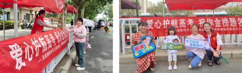 “愛心助考點”服務站內(nèi),高考專用尺、簽字筆、鉛筆、橡皮等文具整齊擺放,為考生解決不時之需。志愿者們身著統(tǒng)一服裝,手拿“逢考必勝”“加油,你一定可以”“全力出擊 踏歌前行”等祝福手卡,用微笑表達對高考學子的祝福。