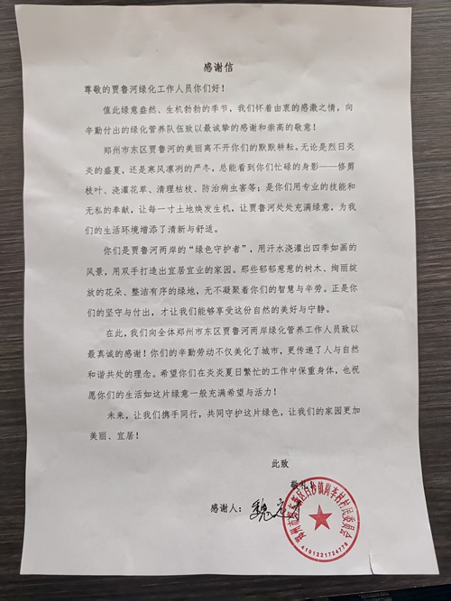 近日,鄭州市賈魯河綠化養(yǎng)護工作收獲暖心認可。鄭東新區(qū)崗李村村委向養(yǎng)護團隊贈送錦旗和感謝信,以“朝迎晨露修枝葉,暮披霞光護綠茵” 贊揚工作人員的辛勤付出。