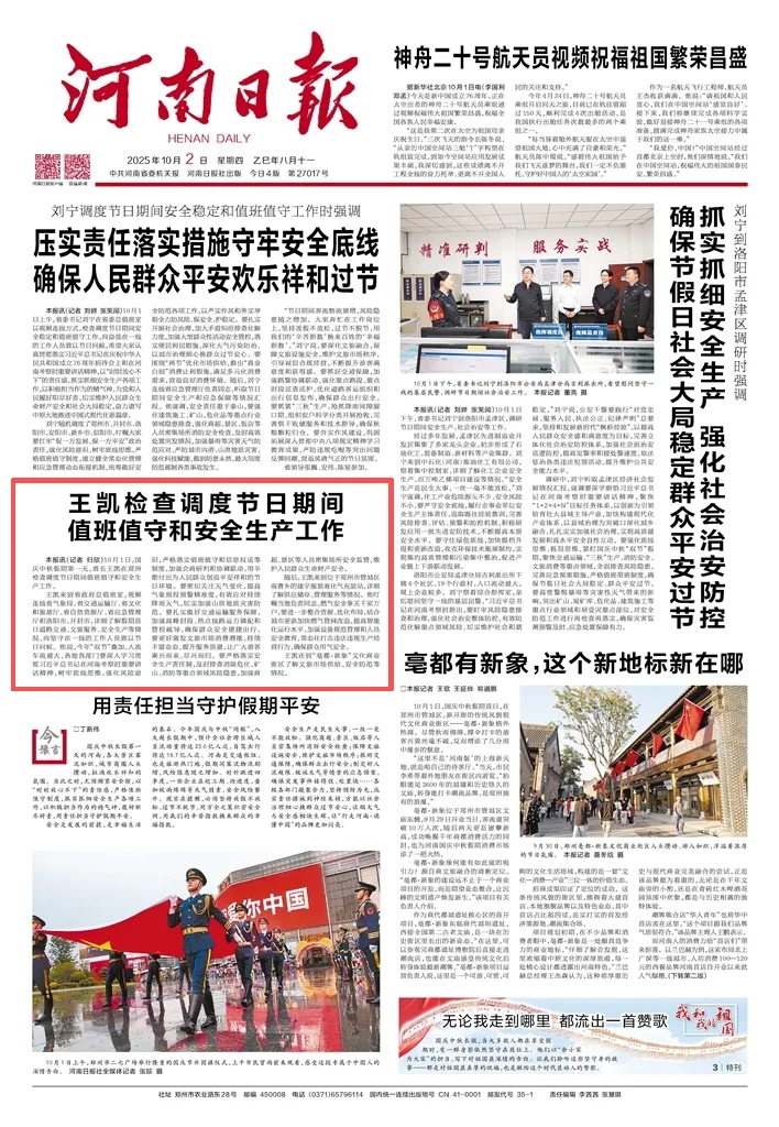 王凱來到省政府總值班室,視頻連線省氣象局、省交通運輸廳、省文化和旅游廳、省自然資源廳、省應急管理廳和洛陽市、開封市,詳細了解假期首日道路交通、文旅服務、安全生產(chǎn)等情況,向堅守在一線的工作人員致以節(jié)日問候。他說,今年“雙節(jié)”疊加,人流車流量大,各地各部門要深入學習貫徹習近平總書記在河南考察時重要講話精神,樹牢底線思維,強化風險意識,嚴格落實值班值守和信息報送等制度,加強會商研判和協(xié)調聯(lián)動,用辛勤付出為人民群眾創(chuàng)造平安祥和的節(jié)日環(huán)境。要密切關注天氣變化,提高氣象預報預警精準度,有效應對持續(xù)降雨天氣,切實加強山洪地質災害防范。要扎實做好交通運輸服務保障,加強高峰時段、熱點線路運力調配和管控疏導,確保群眾安全便捷出行。要更好激發(fā)文旅市場消費潛能,持續(xù)豐富業(yè)態(tài),提升服務質量,讓廣大游客乘興而來、盡興而歸。要嚴格落實安全生產(chǎn)責任制,及時排查消除危化、礦山、消防等重點領域風險隱患,加強商超、景區(qū)等人員密集場所安全監(jiān)管,維護人民群眾生命財產(chǎn)安全。
