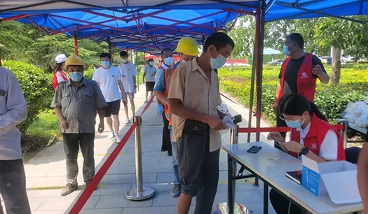 由于龍湖社區(qū)內(nèi)工地?cái)?shù)量多,人員流動性大,檢測人群普遍年齡偏大,給檢測工作著實(shí)帶來一定難度。尤其是有一位工友,左腿受傷骨折,打著石膏拄著拐杖來做檢測,他沒有拿身份證且隨行人員都不會熟練操作手機(jī)掃碼,但在志愿者的引導(dǎo)下,從帶領(lǐng)他走愛心通道、到協(xié)助錄入信息、幫助他們?nèi)私仄亮舸嬉约白罱K完成檢測,志愿者認(rèn)真的工作態(tài)度得到了工友和社區(qū)工作者的高度贊揚(yáng)。檢測期間,志愿小隊(duì)統(tǒng)一按照社區(qū)的調(diào)度安排,各司其職,專人專崗,一切行動聽指揮,做到了各環(huán)節(jié)專人負(fù)責(zé)和快速反饋,整體檢測工作快速有序的進(jìn)行,僅在15日一天,社區(qū)就完成了4000余人次的檢測。來自龍湖社區(qū)的居民表示,第四次核酸檢測相較于前幾次效率明顯提高且秩序良好,從最初的半個小時以上到現(xiàn)在的幾分鐘,這不僅是效率質(zhì)變,更是廣大一線工作人員的付出心血,大家都非常感謝他們。