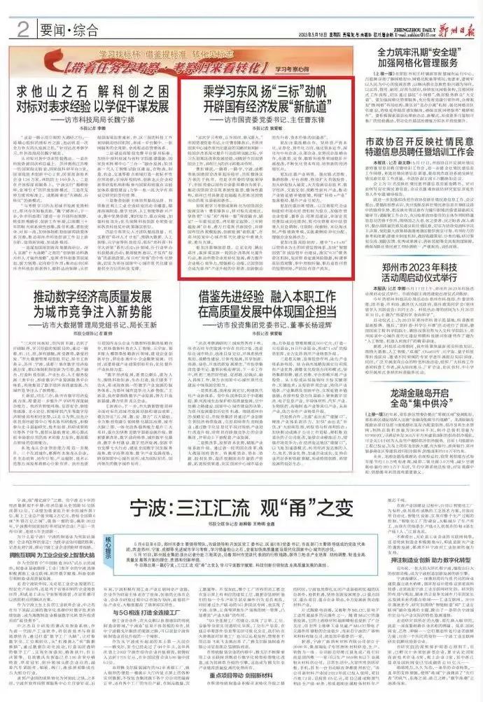 5月18日,《鄭州日報》刊發(fā)市國資委黨委書記、主任曹東鋒專訪文章《乘學習東風 揚“三標”勁帆 開辟國有經(jīng)濟發(fā)展“新航道”》,為您全文分享如下——